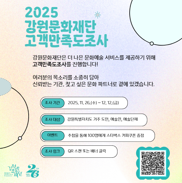 [2025 강원문화재단 고객만족도조사]강원문화재단은 더 나은 문화예술 서비스를 제공하기 위해고객만족도조사를 진행합니다! 여러분의 목소리를 소중히 담아신뢰받는 기관, 찾고 싶은 문화 파트너로 곁에 있겠습니다. *참여 링크: https://forms.gle/tkperVTxowjrN3fT8*참여 기간2025. 11. 26.(수) ~ 12. 12.(목) *조사 대상강원특별자치도민 * 참여 혜택설문에 응답해주신 분들 중 100명을 추첨하여 커피 쿠폰을 드립니다.※ 이벤트 참여 시 개인정보 제공 동의 및 입력 필수※ 당첨자 발표: 12월 셋째주 재단 홈페이지 공지사항 탑재