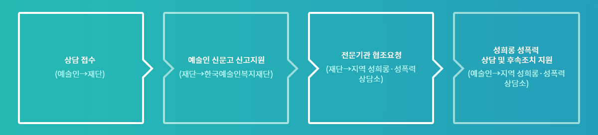 • 성희롱·성폭력 고충, 피해 한국예술인복지재단 신고지원 및 지역 전문 상담소 상담 연계 및 추가 사후지원 등